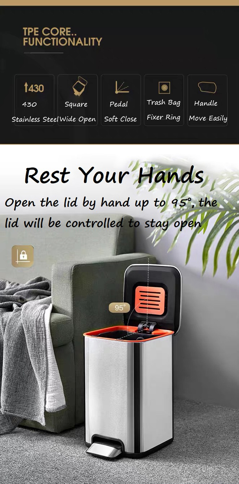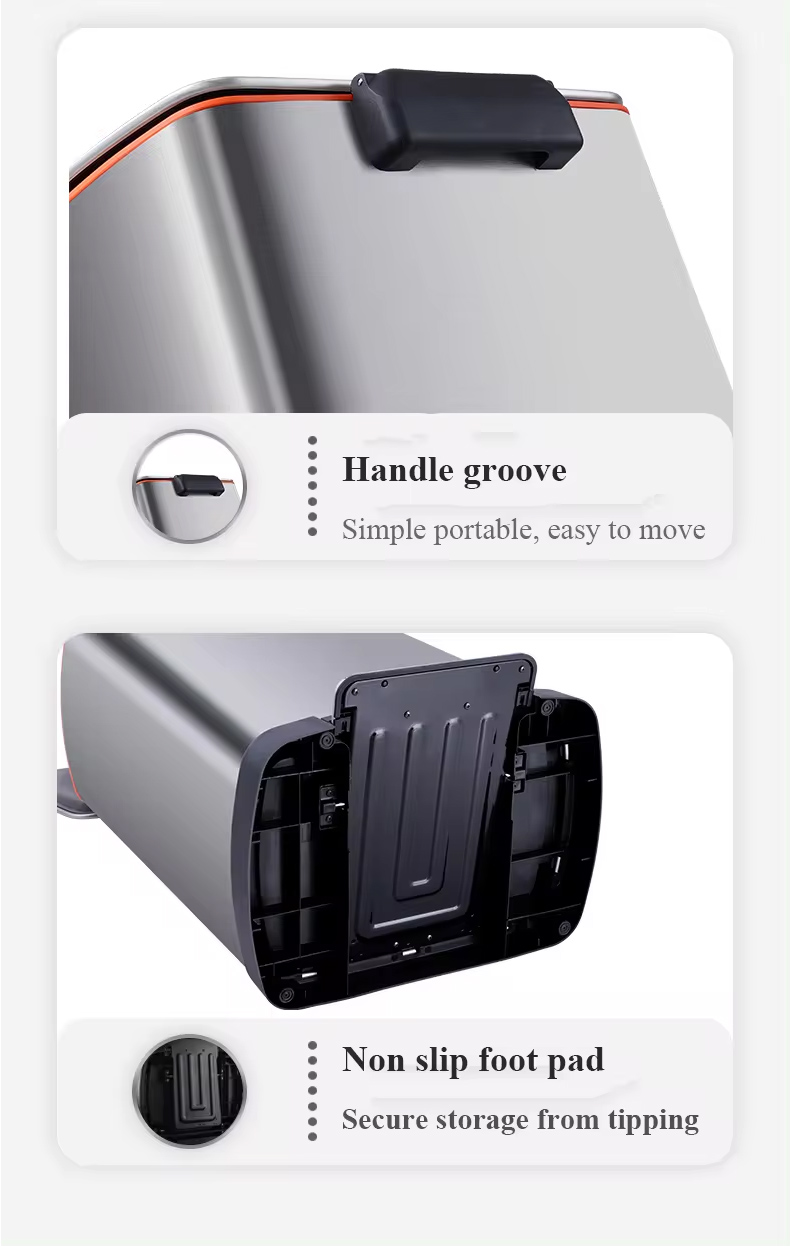 Dieser Edelstahl-Mülleimer mit Fußpedal verfügt über eine innovative „Innentasche“, in der ein aufgerollter Müllbeutel oder Kampferbälle aufbewahrt werden können, was dazu beitragen kann, die Insekten zu reduzieren oder den Müllbeutel schneller zu wechseln. Er ist gut im Boden versteckt des Mülleimers. Mit dem stabilen PP-Inneneimer ist es viel bequemer, den Müllsack unter dem Deckel zu platzieren und zu verstecken. Darüber hinaus sorgt der Retarder im Inneren des Behälters dafür, dass er jederzeit sanft und geräuschlos schließt. Die Oberfläche des Mülleimers besteht aus 430er-Edelstahl, der mit einer matten Oberfläche versehen ist, um Fingerabdrücke und Rost zu verhindern.